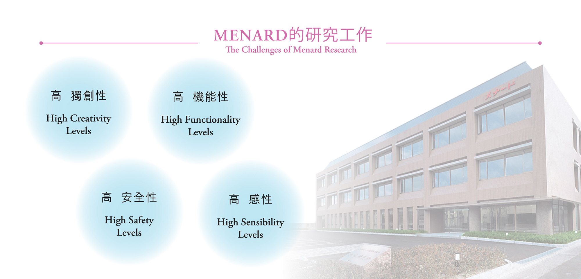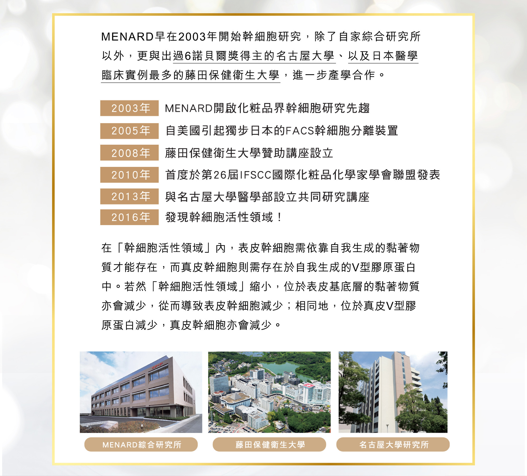 MENARD綜合研究所於2008年與日本藤田醫科大學醫學部聯手,開設應用細胞再生醫學講座,產學結合推動實現肌膚再生醫療的進化。在2013年再與名古屋大學院醫學院研究科共同開設名古屋大學MENARD協同研究講座,與諾貝爾獎得獎者輩出的名古屋大學運用其研究成果,共用最先端的研究設施提升MENARD基礎肌膚機制研究實力,以蘊含未知神秘的幹細胞生物學為主軸,不斷於商品開發中呈現研究精隨。